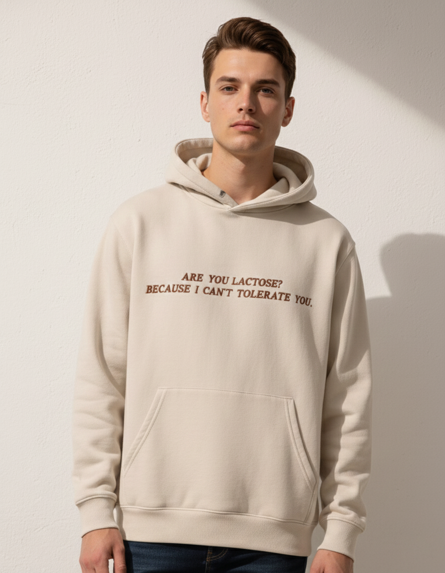 Finally, a hoodie that speaks your truth so you don’t have to. Featuring a clean, minimalist cream canvas and high-contrast embroidery, this piece blends premium comfort with a healthy dose of wit. Whether you’re actually lactose intolerant or just low on social patience, this hoodie is designed to keep you cozy while setting the record straight.
